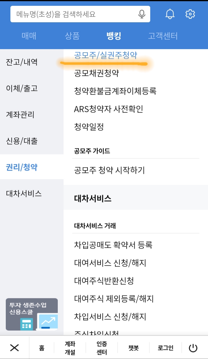 2. 상단에 뱅킹 클릭 후 권리/청약 - 공모주/실권주 청약 눌러주세요.