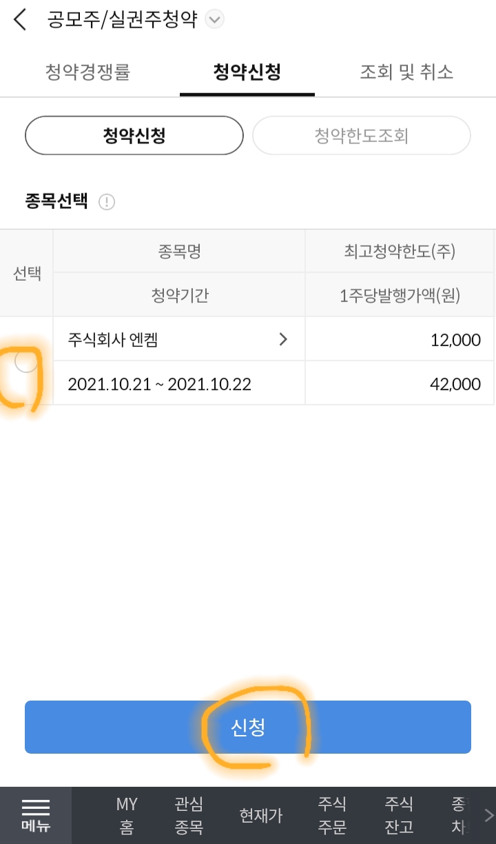 3. 청약신청 클릭 후 엔켐 선택해주세요. 하단에 신청 눌러주세요.