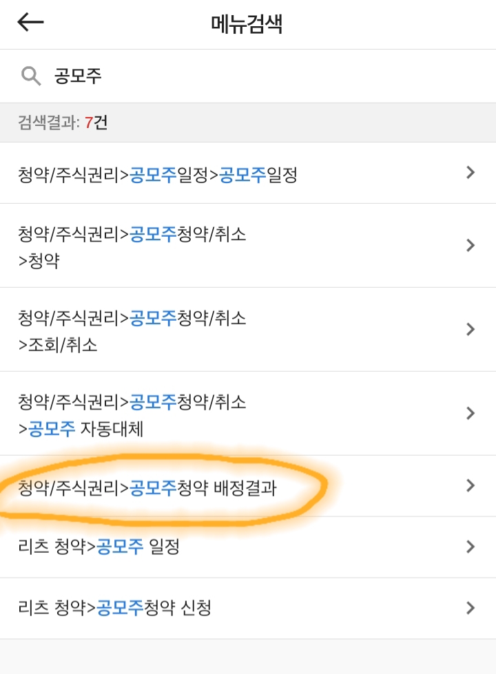 청약/주식 권리> 공모주 청약 배정 결과 선택해 주세요.