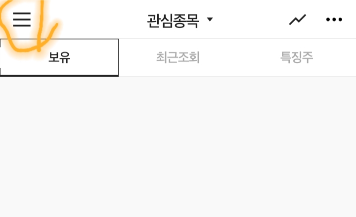 대신증권 크레온 앱 접속한 화면입니다. 좌측 상단에 줄 세 개 선택해 주세요.