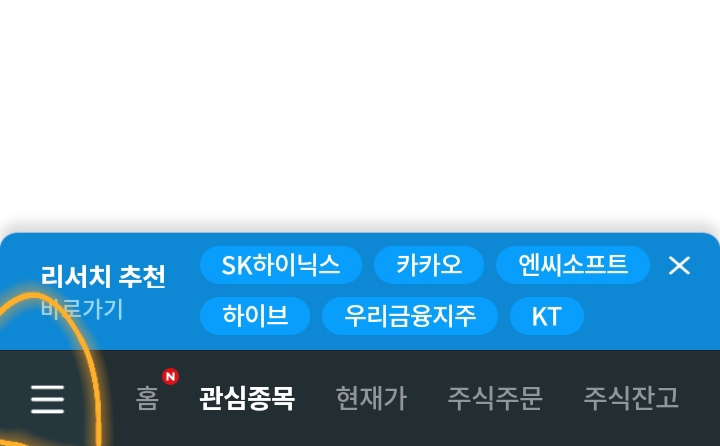 비트나인 증거금 표 확인 후 원하는 금액을 계좌에 입금해 주세요. (10주 청약하시려면 55000원 입금하시면 됩니다) 하나투자증권프로 앱 접속 후 왼쪽 하단에 메뉴를 클릭해 주세요.