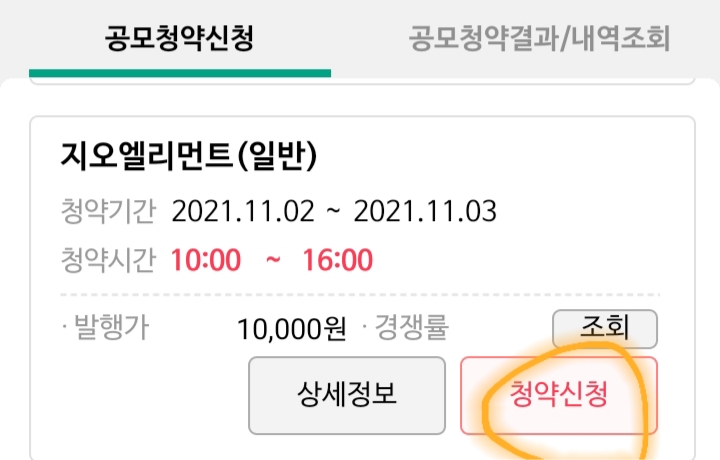 지오엘리먼트 청약 후 신청 확인하시려면 상단 오른쪽에 있는 공모 청약결과/내역 조회 누르시면 됩니다.