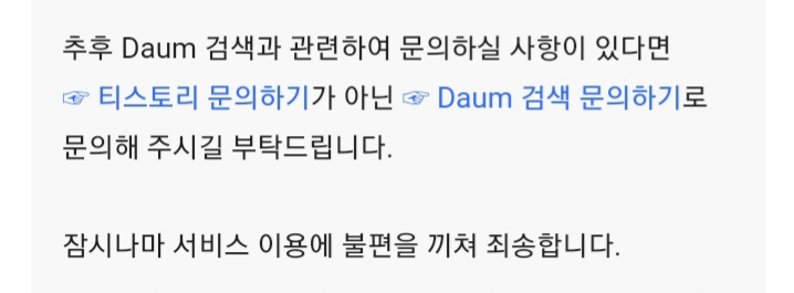 급하게 하느라 티스토리 문의하는 데에 문의 메일 했나 봐요. 다음 검색과 관련해서 다음 검색 문의하기 https://cs.daum.net/question/15.html