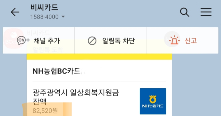 카카오톡으로 비씨카드 사용내역과 일상회복지원금 잔액 알림이 오네요.