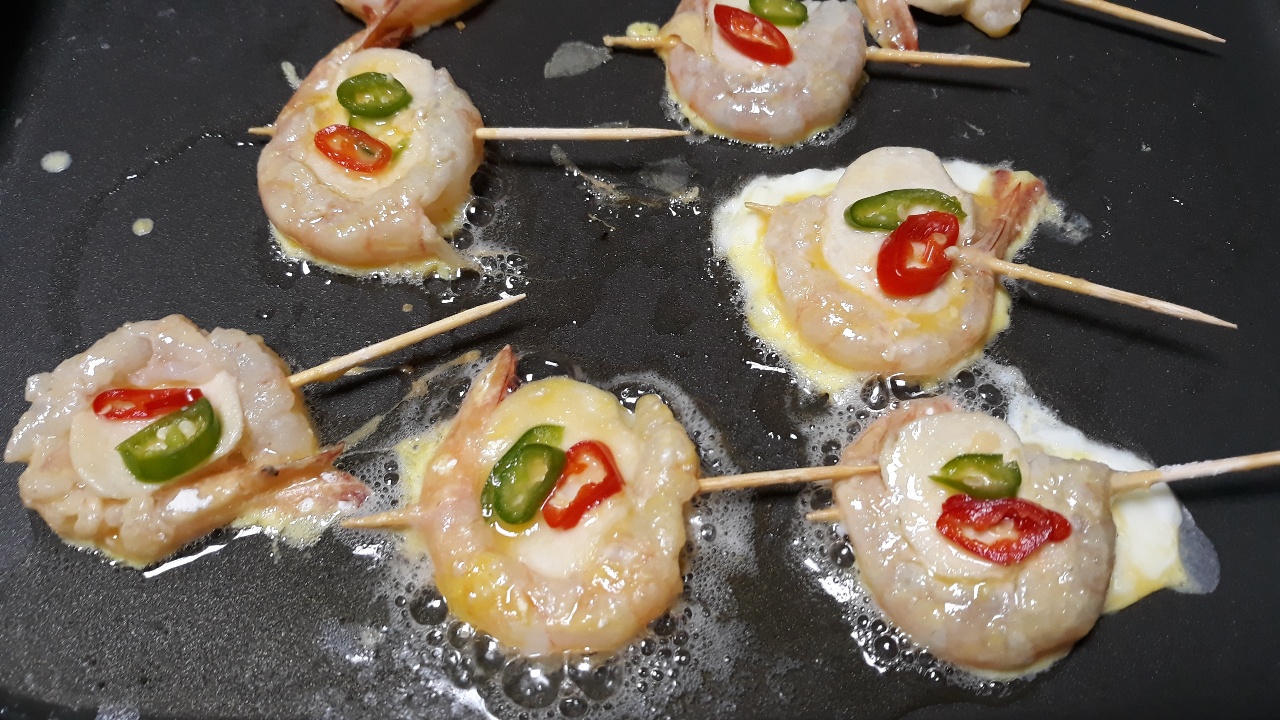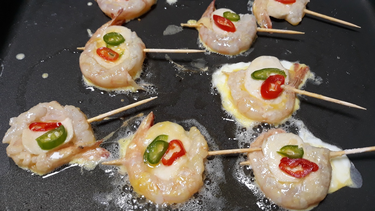 유튜브에서 우연히 새우버섯전 만드는 걸 봤는데 모양도 특이하고 맛있겠더라고요. 손질된 새우 긴 거 두 팩 사서 새우버섯전을 부쳤어요. 팁을 드리자면 새송이버섯은 두껍게 잘라야 합니다. 너무 얇게 썰었더니 꼬지 꽂으면 버섯이 결 따라 부서지더라고요.