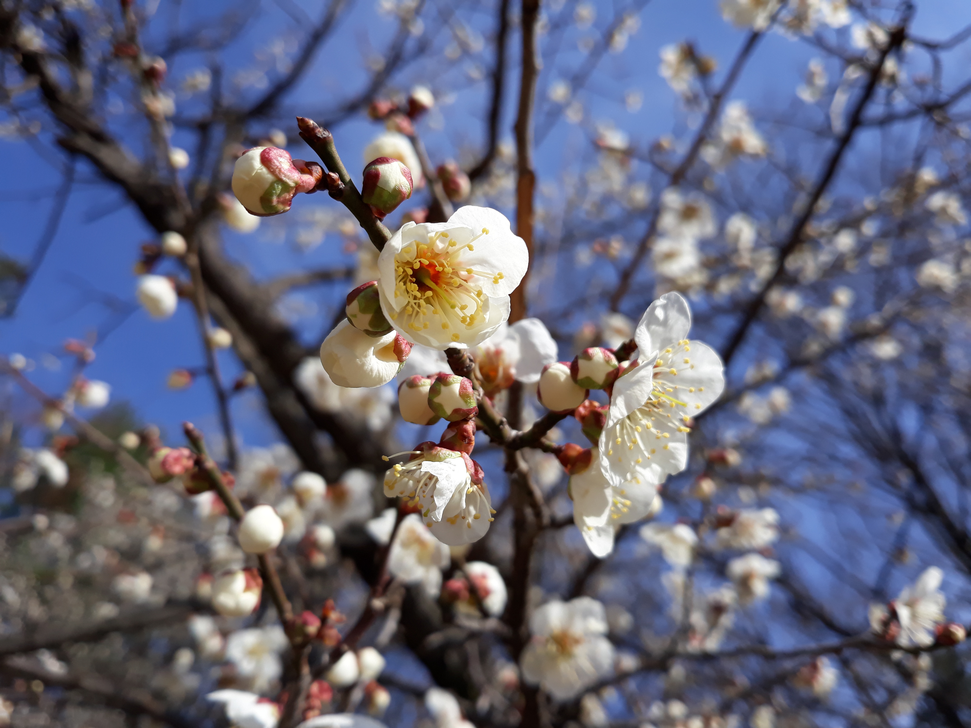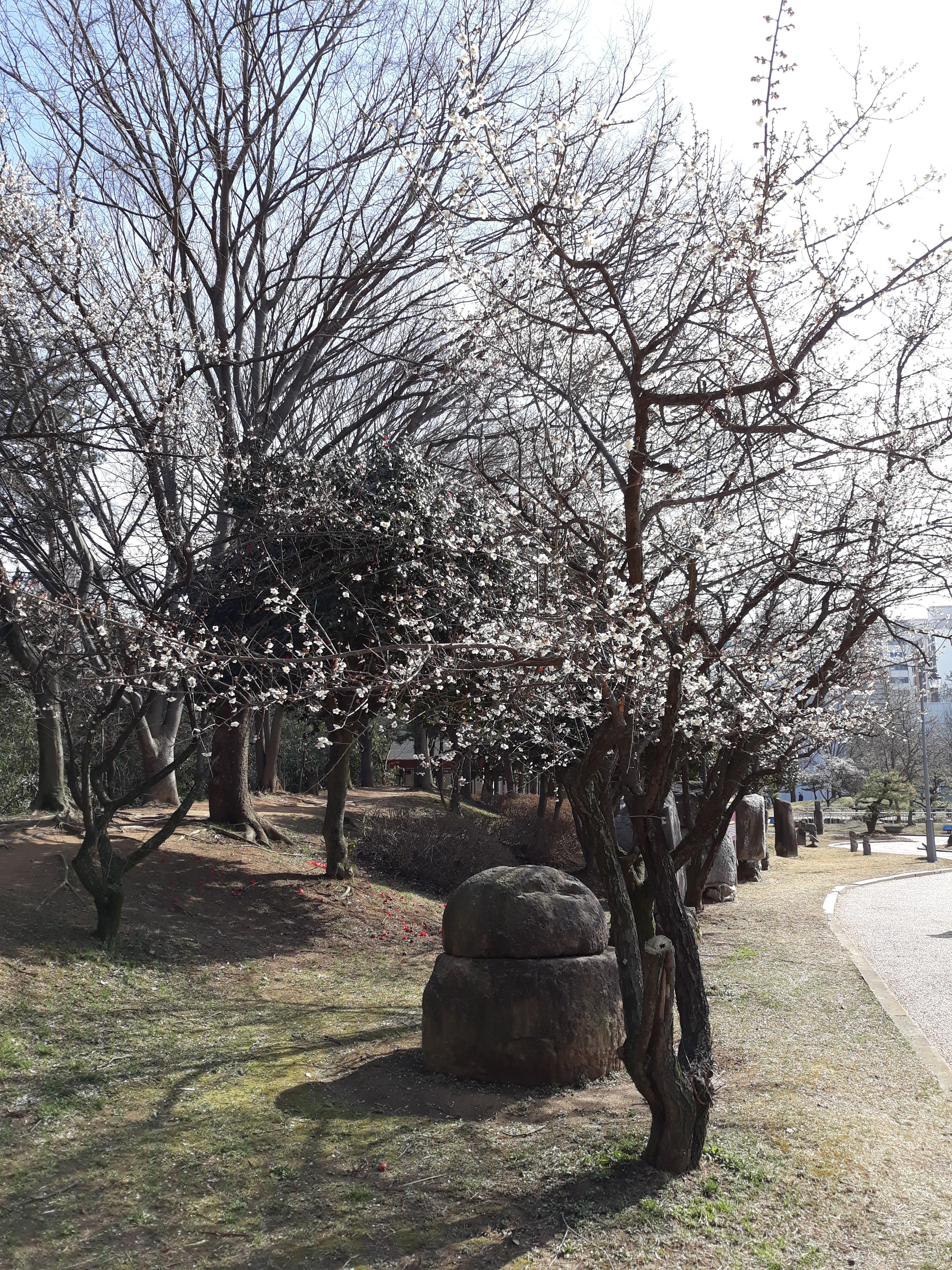 중외공원에서 흰 매화꽃은 광주역사민속박물관 쪽으로 보러 가요. 나무가 두세 그루밖에 없지만 크기가 커서 꽃이 많이 피거든요. 홍매화 피는 곳은 광주시립미술관 건너편 야외공연장 근처에 있어요.