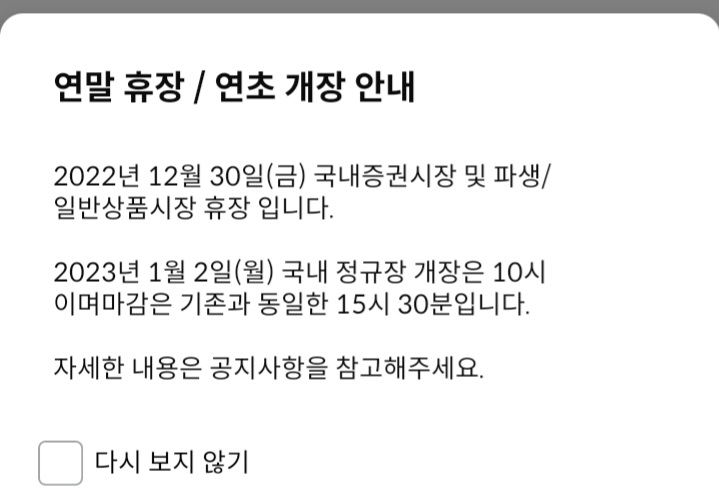 22년 12월 30일 오늘 휴장 합니다. 23.1.1일 당연히 쉬고 23,1,2일은 개장하는데 정규장 개장 시작이 1시간 늦게 시작하네요.