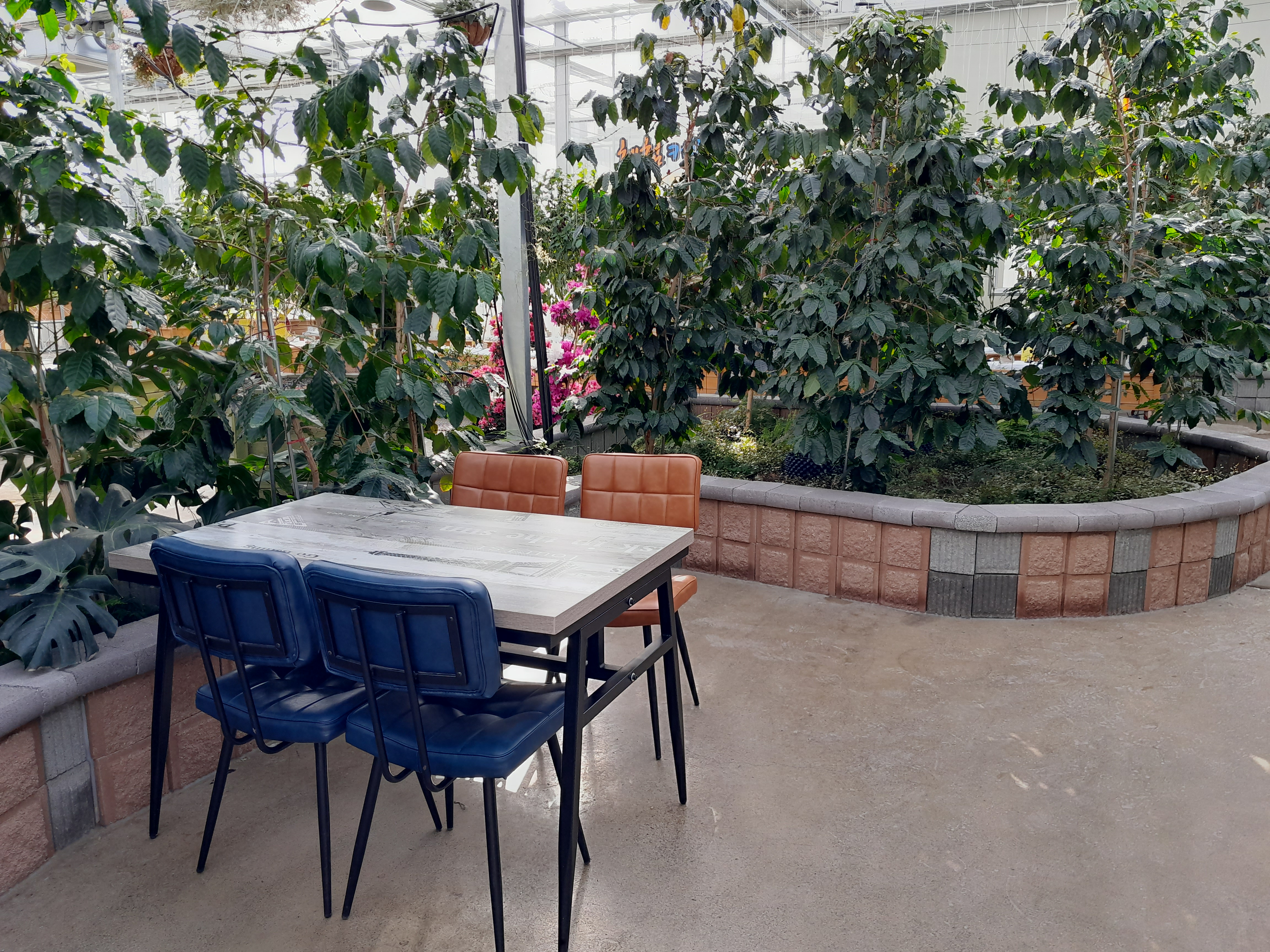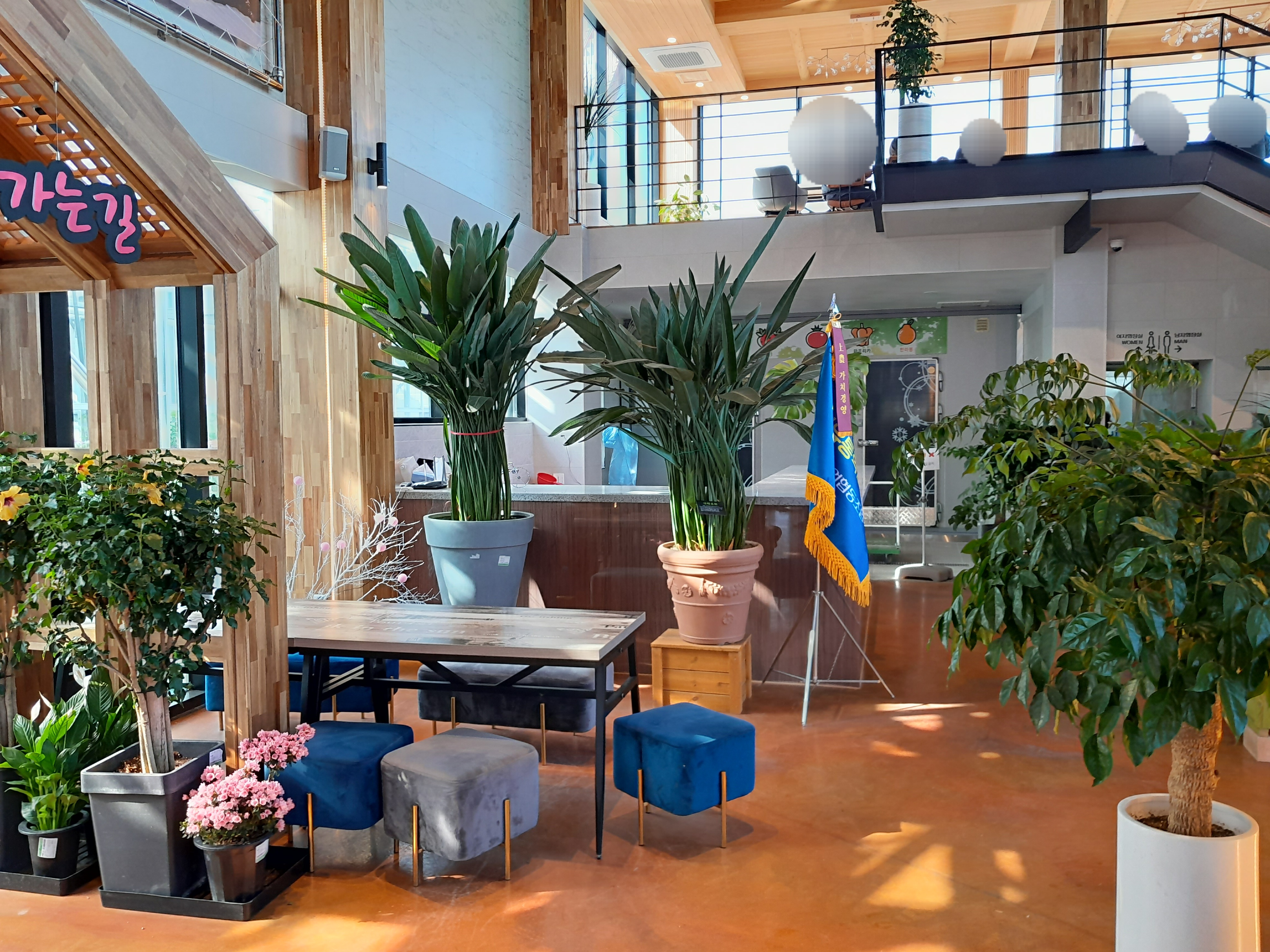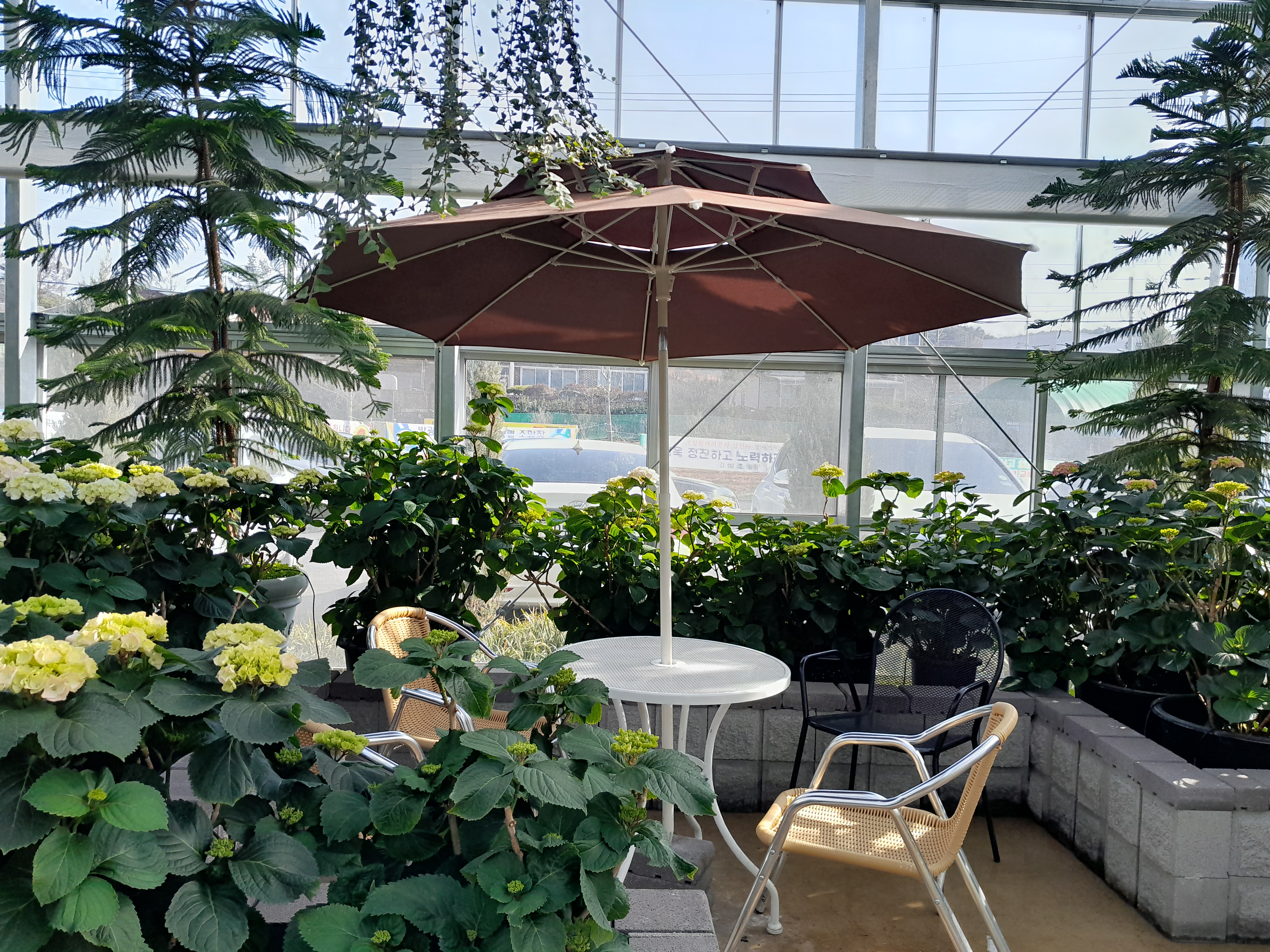 도곡 스마트팜 안에 쉴 수 있는 테이블이 많이 있어요.