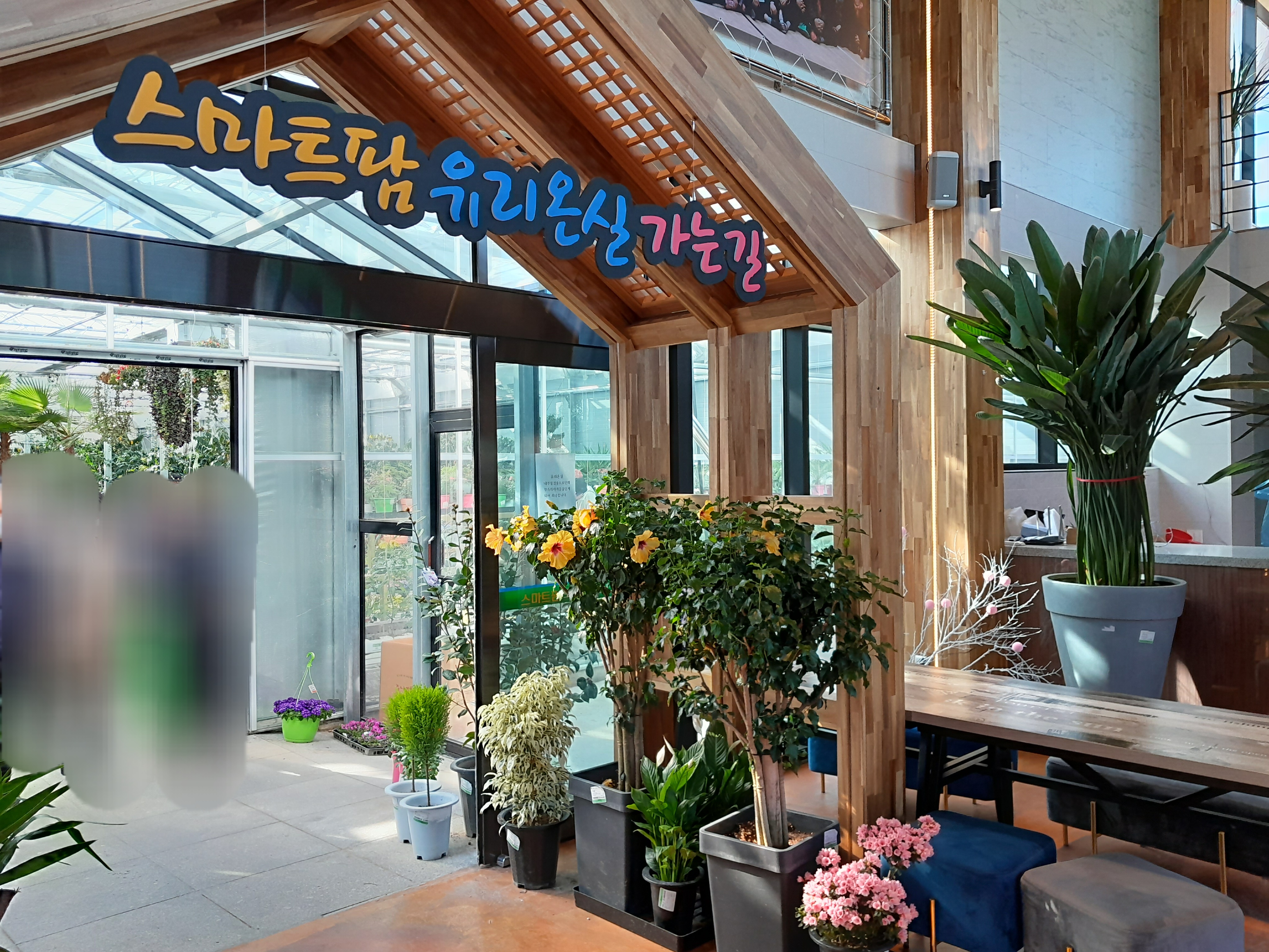 건물에 들어와서 왼쪽에 스마트팜 유리온실 입구가 있습니다.