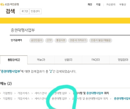 검색창에 증권대행사업부 검색해서 증권대행업무 클릭했어요.