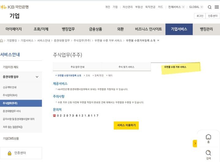 작년에 공모주 할 때 스팩주를 많이 샀더니 우편물 폭탄을 받았습니다. 국민은행 홈페이지에서 우편수령 거부 할 수 있어요. 핸드폰에서 크롬 웹브라우저로도 신청됩니다.