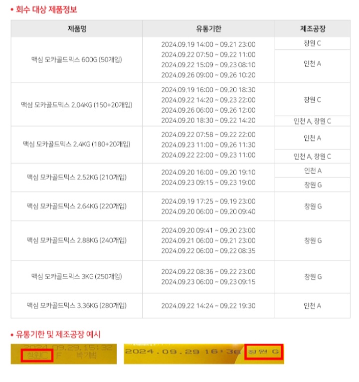 맥심모카골드믹스 제품에 실리콘 이물 혼입 가능성이 있어서 회수조치 한다고 해요. 대충 보니까 유통기한 2024년 9월인 제품들이 문제네요. 교환 또는 환불진행하실 분은 고객센터 080 023 9114 연락하면 된다고 하네요.