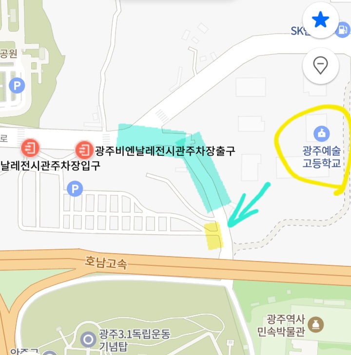 광주비엔날레 주차장 입구는 막아놨던데... 화살표로 표시한 부분으로 가도 차량진입 가능합니다. 비엔날레 시작하고는 또 어떻게 해놓을지는 모르겠네요.