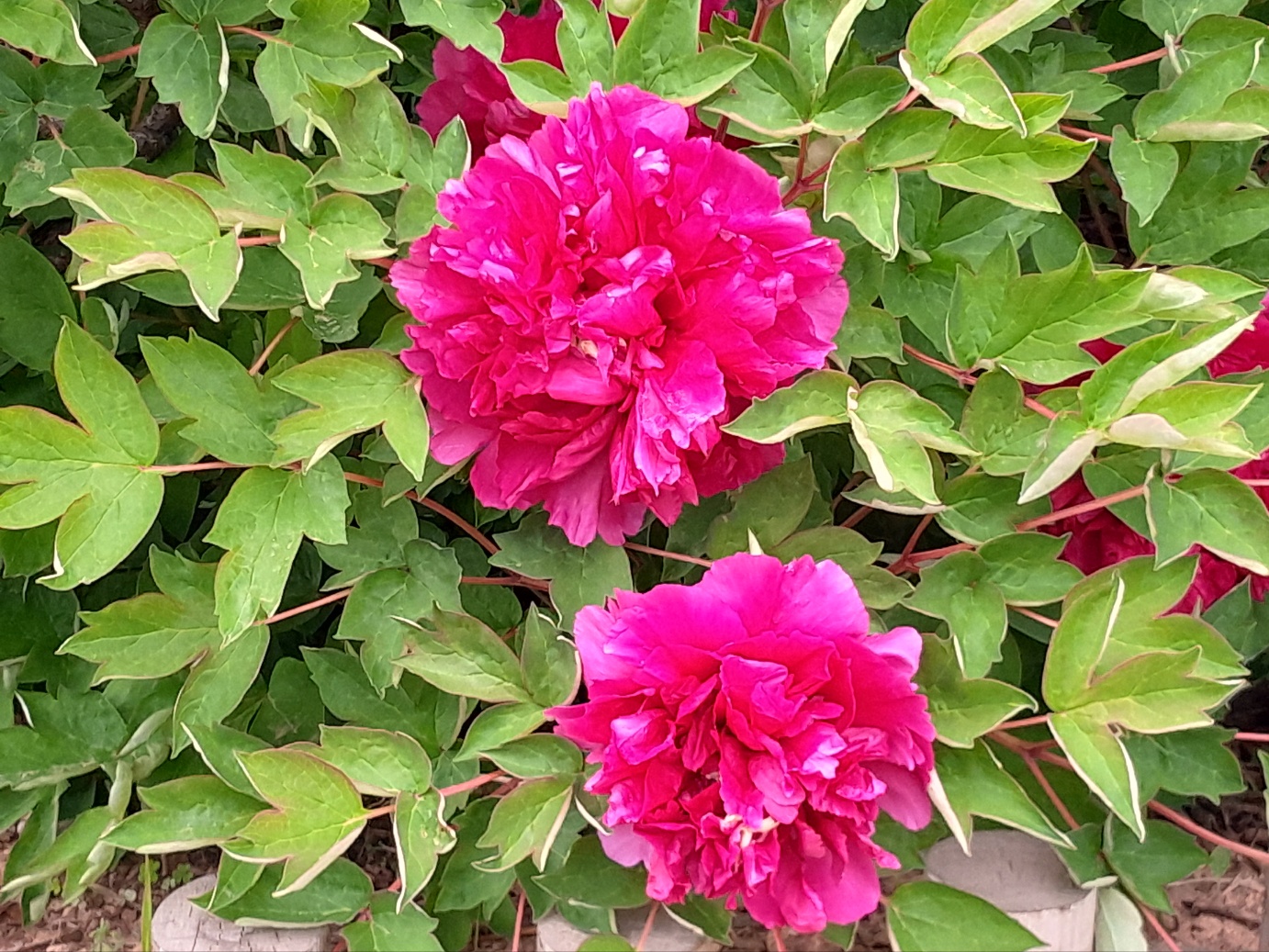 광주국립박물관 입구 양쪽화단에 모란꽃이 활짝 폈어요. 꽃 크기가 크고 화려하네요.