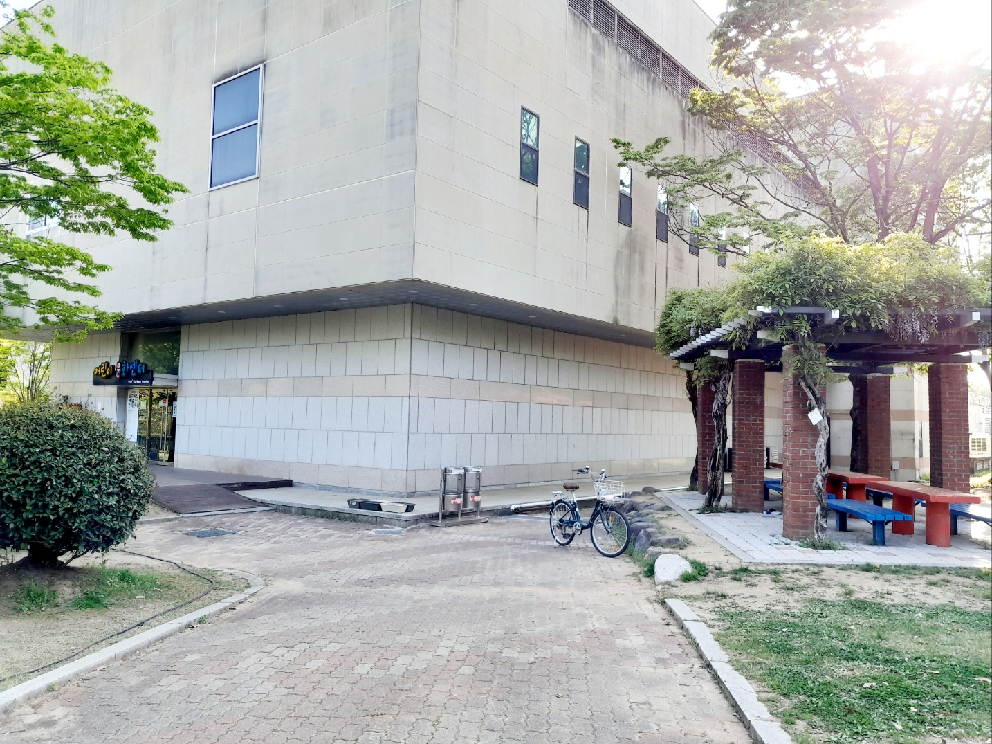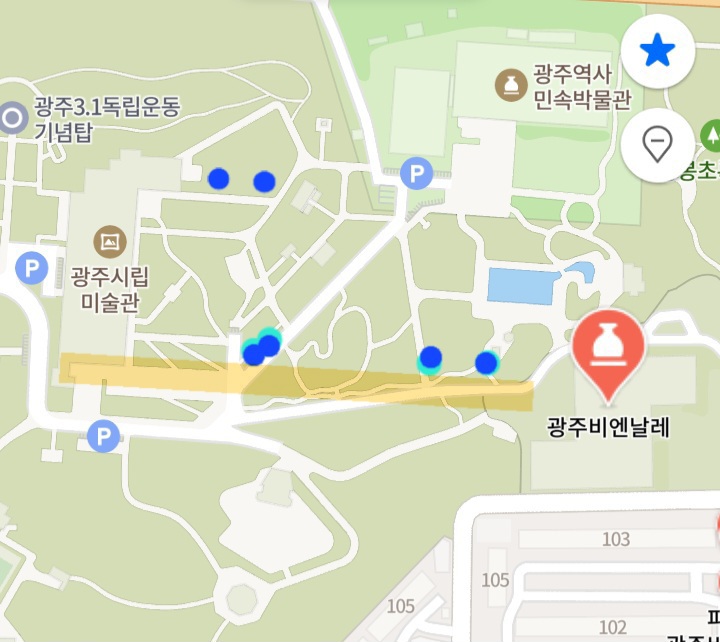 파란색이 표시한 부분이 등나무 벤치가 있어요. 중외공원 테니스장 근처에도 있는데 지금은 공사 중이라 막아놨어요.