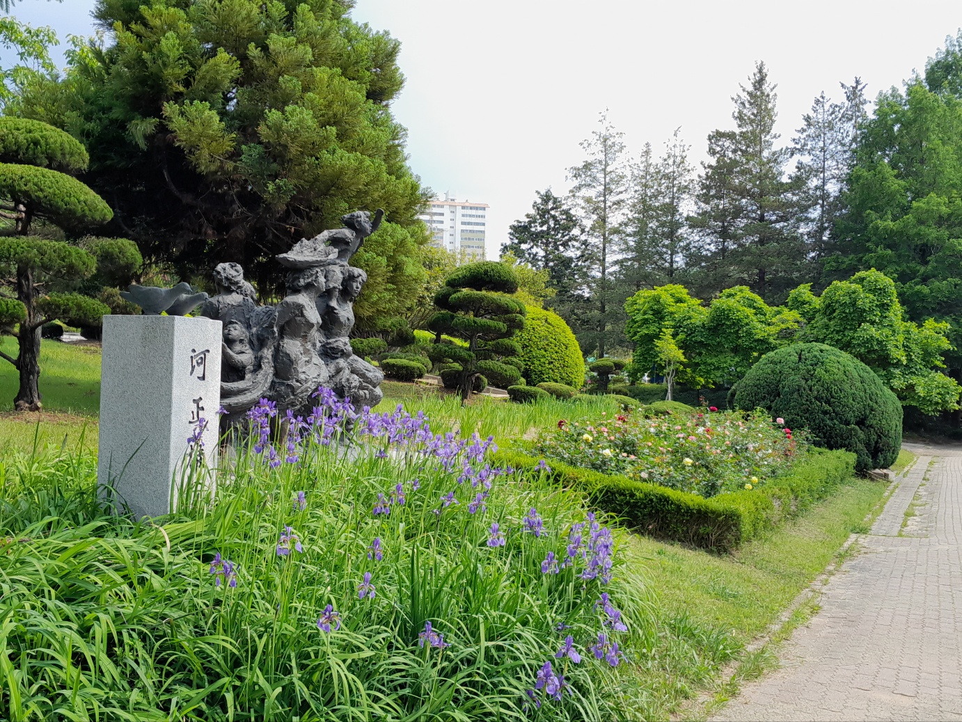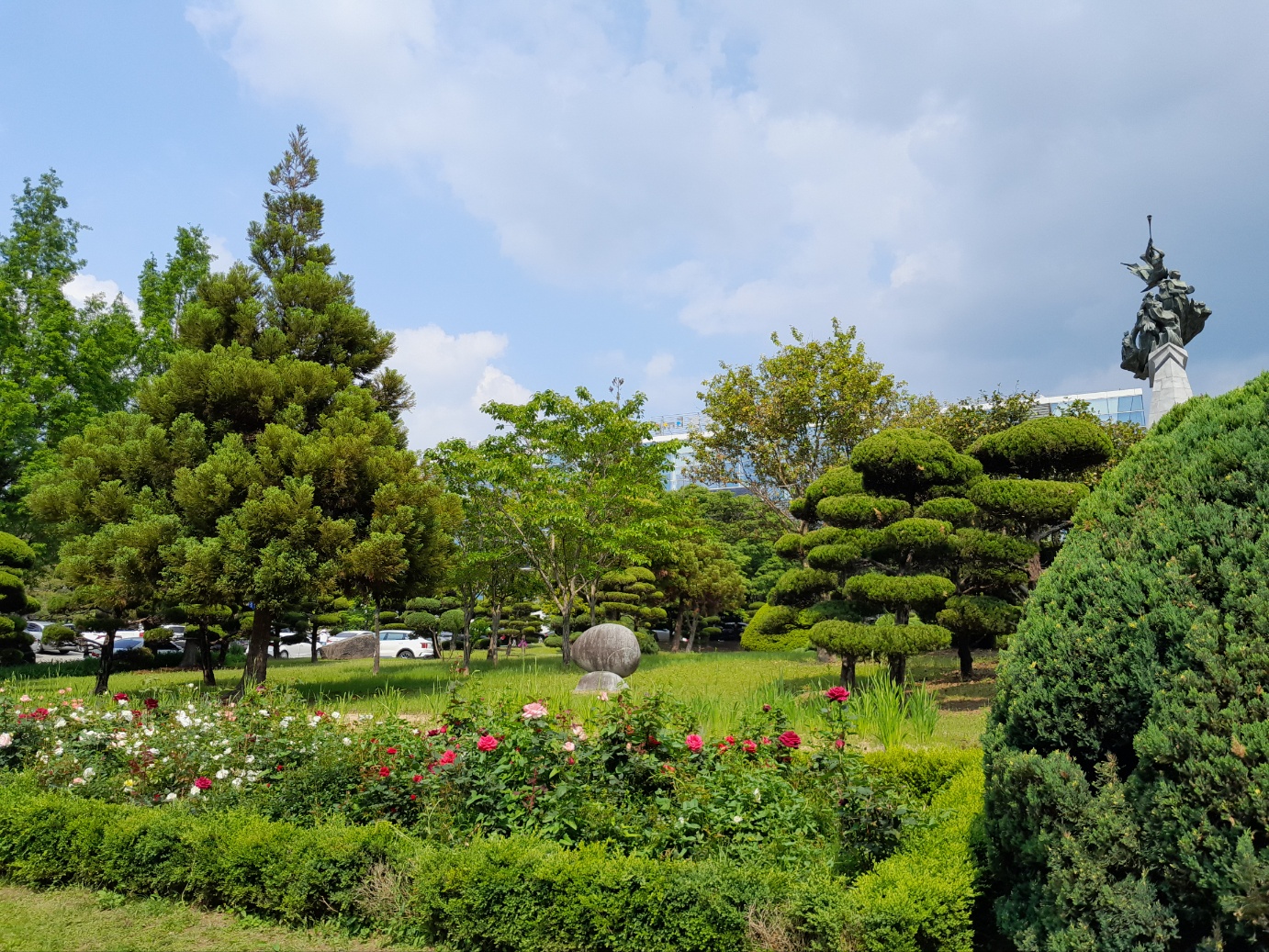 광주시립미술관 정문을 바라봤을 때 큰 차도까지 왼쪽으로 쭉 내려오시면 돼요. 사진 오른쪽에 있는 동상뒤에 시립미술관이 보이네요. 장미화단이 크지는 않지만 용봉동 근처에 장미볼만 한 데가 없어서 만족스러워요.