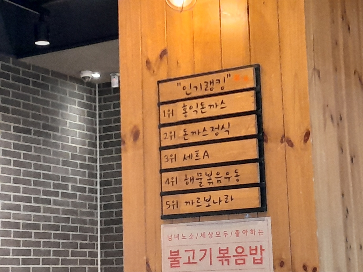 인기랭킹 1위는 홍익돈까스, 2위는 돈까스정식 12500원, 3위는 세트A 11900원, 4위는 해물볶음우동, 5위는 까르보나라라고 쓰여있네요.