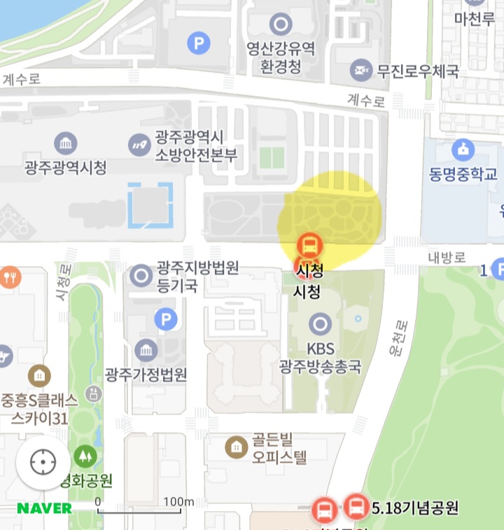 노란색으로 표시한 부분이 광주 시청 장미공원이에요. 버스정류장 바로 옆에 있어요.
