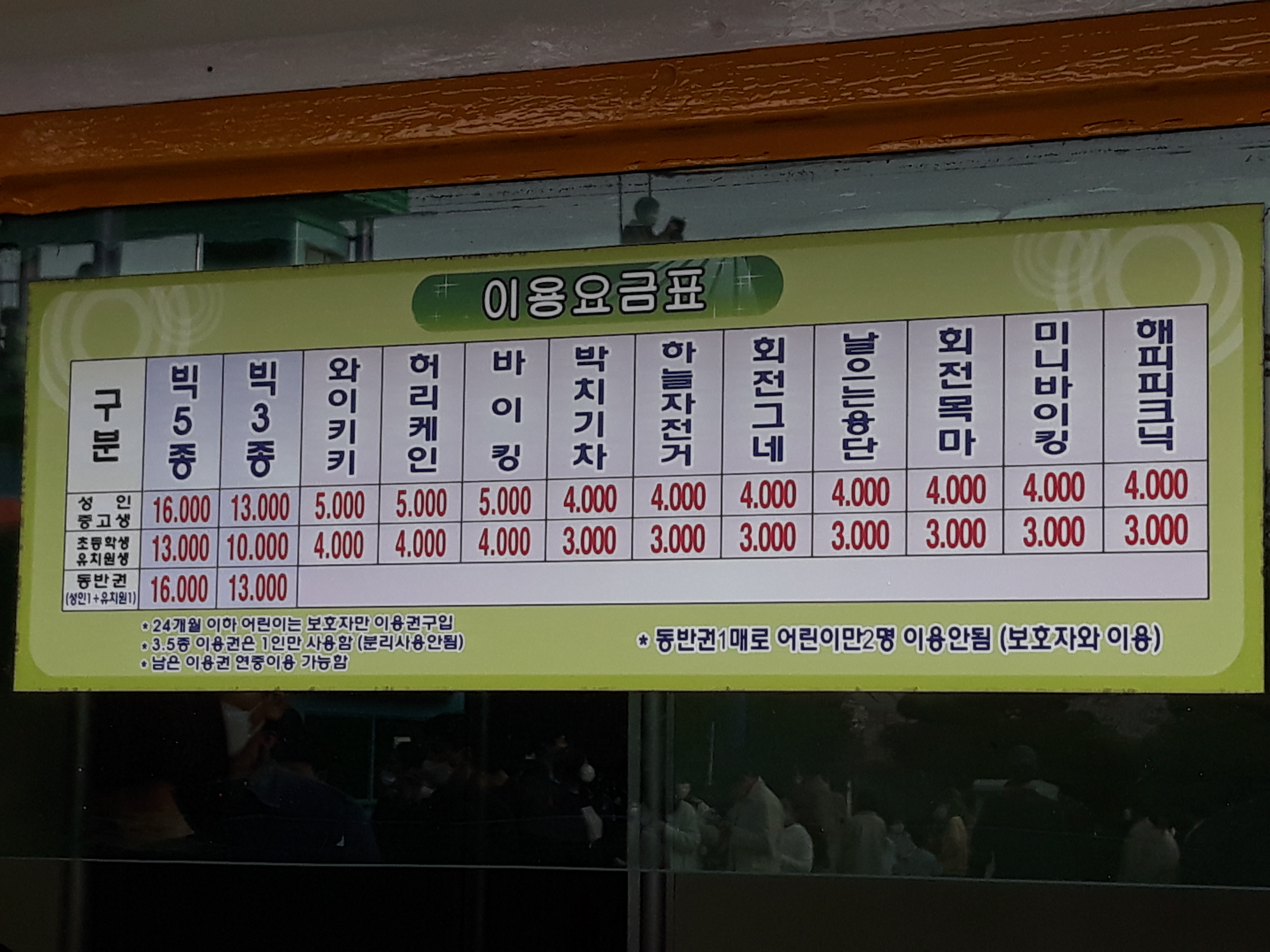 빅 5종, 빅 3종처럼 한꺼번에 끊는 것도 있었네요. 그런데 뭐가 5종일까요 이건 다음에 알아오겠습니다 ㅋ 사용하지 않은 이용권은 언제든 와서 쓸 수 있나 봐요. 그리고 7세 이하 어린이는 안전을 위해서 어른과 같이 타야 하고요. 패밀리랜드처럼 종일권 이런 건 없는 건가. 이것도 사람 없을 때 직원한테 물어봐야겠습니다. 바이킹 재미있게 탔던 기억이 있는데 벚꽃 폈을 때 타면 더 좋을까 아니면 타느라 정신없어서 벚꽃은 눈에 안 들올까 ㅋ