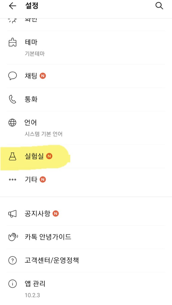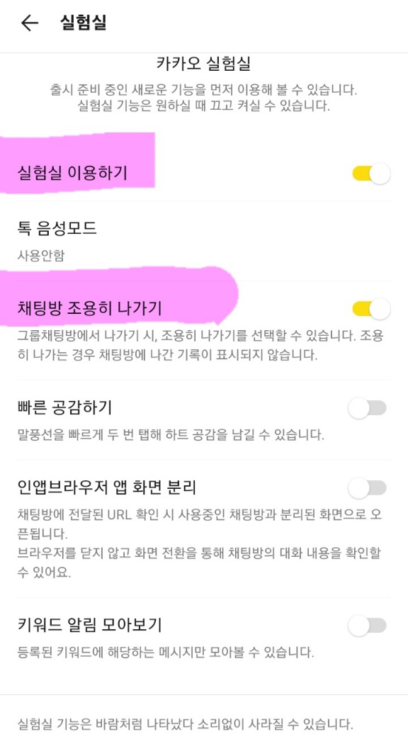 실험실 이용하기 버튼을 활성화시켜 주세요. ○표시를 누르면 회색이 노란색 되는 게 보이면서 활성화될 거예요.