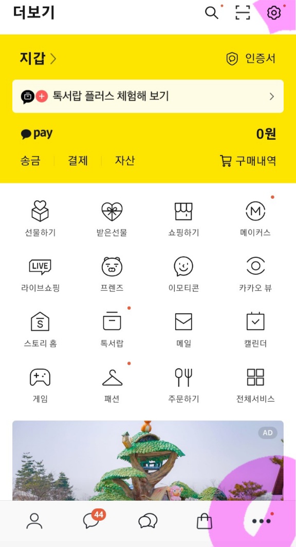 먼저 화면 하단 오른쪽에 있는 점세(메뉴)를 누른 후 화면 상단에 있는 톱니바퀴(설정)를 눌러주세요.
