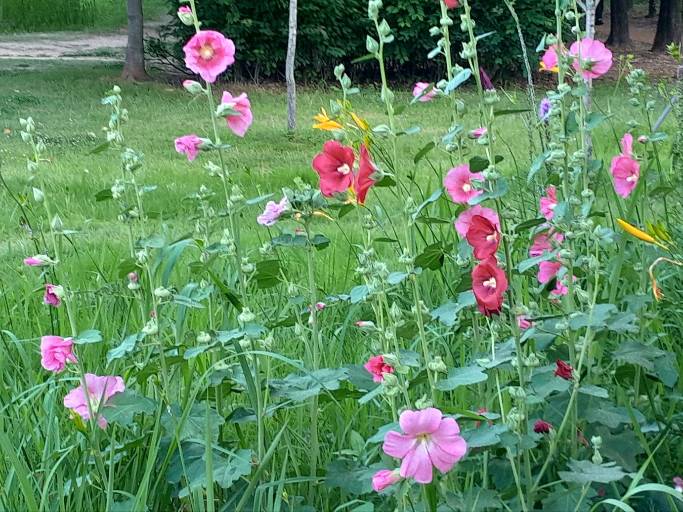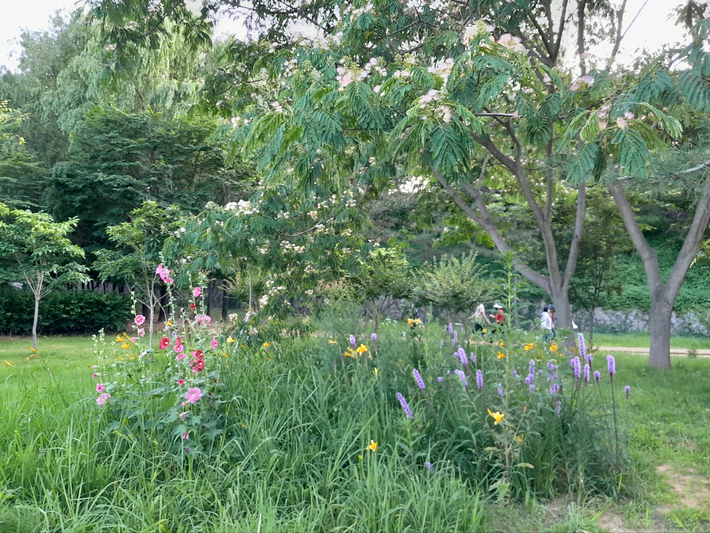 자귀나무 근처에 접시꽃이 많이 피었어요.