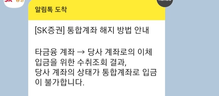 sk스팩 하려고 돈을 이체하는데 안되더라고요. sk증권 주파수 앱을 전날 로그인 해보고 이상이 없어서 안심했는데 이게 무슨 일! 알림톡이 와서 보니 통합계좌라서 입금이 불가능하다고 하네요. 어쨌든 해지하면 되는 것 같아서 방법을 찾아봤어요.
