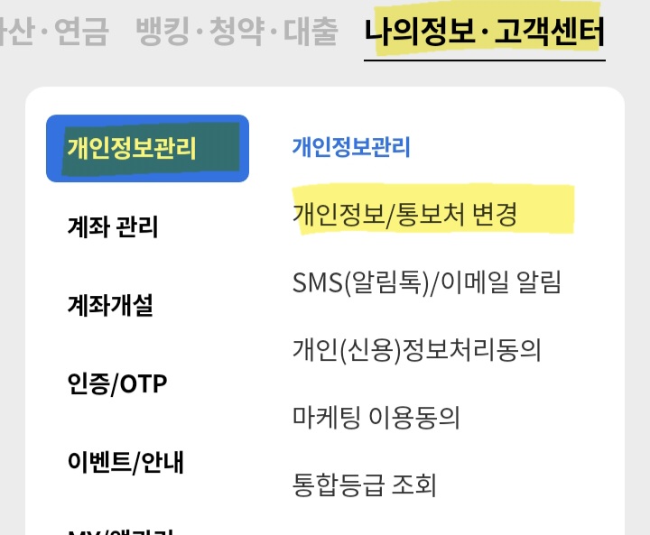 2. 나의 정보ㆍ고객센터 - 개인정보관리 - 개인정보/통보처 변경 선택해 주세요.