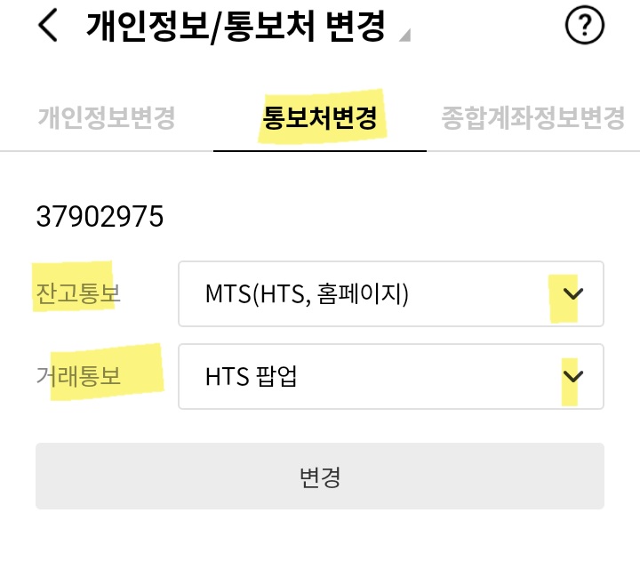 3. 개인정보 / 통보처 변경에서 잔고통보를 자택이 아닌 MTS로 변경하고 거래통보도 HTS팝업으로 했습니다.