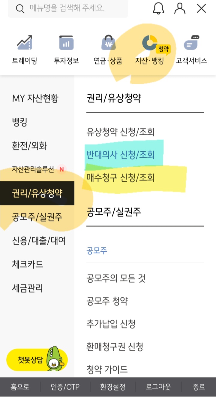 아무래도 처음으로 주식매수청구권 행사를 해봐야겠다. 찾아보니 모바일로도 할 수 있는 것 같은데... 메뉴 - 자산ㆍ뱅킹- 권리/유상청약 보면 반대의사신청, 매수청구 신청이 있다. 여기서 신청하는 것 같고, 회사의 제시가격은 2075원. 나는 66주 있으니 이자로 4905원 받는 건가...