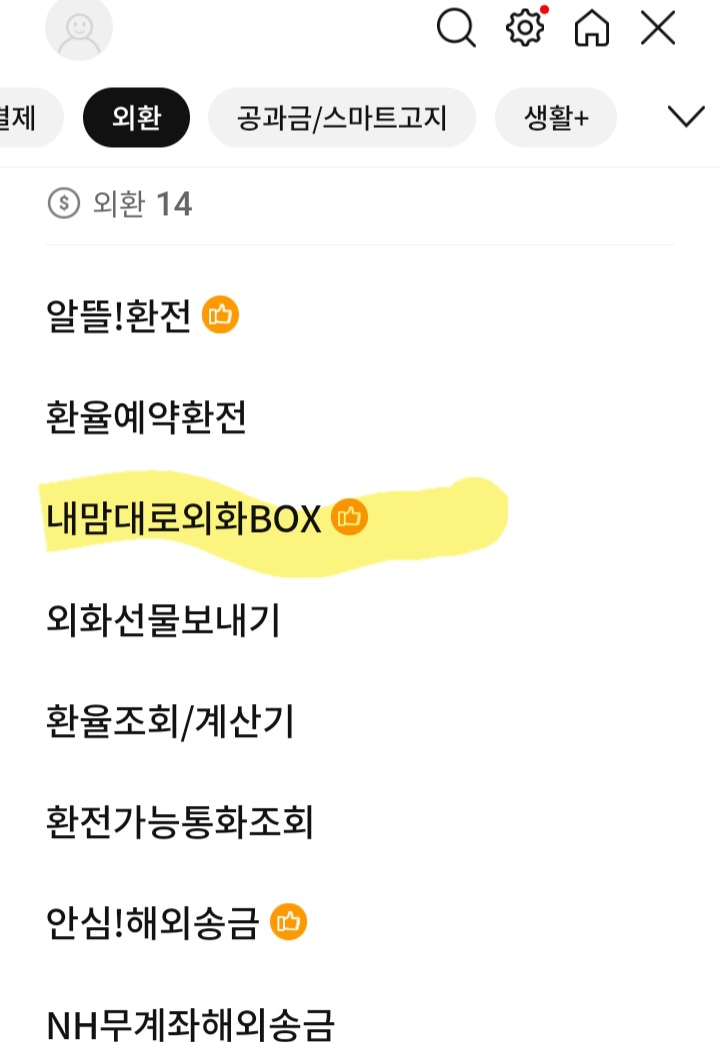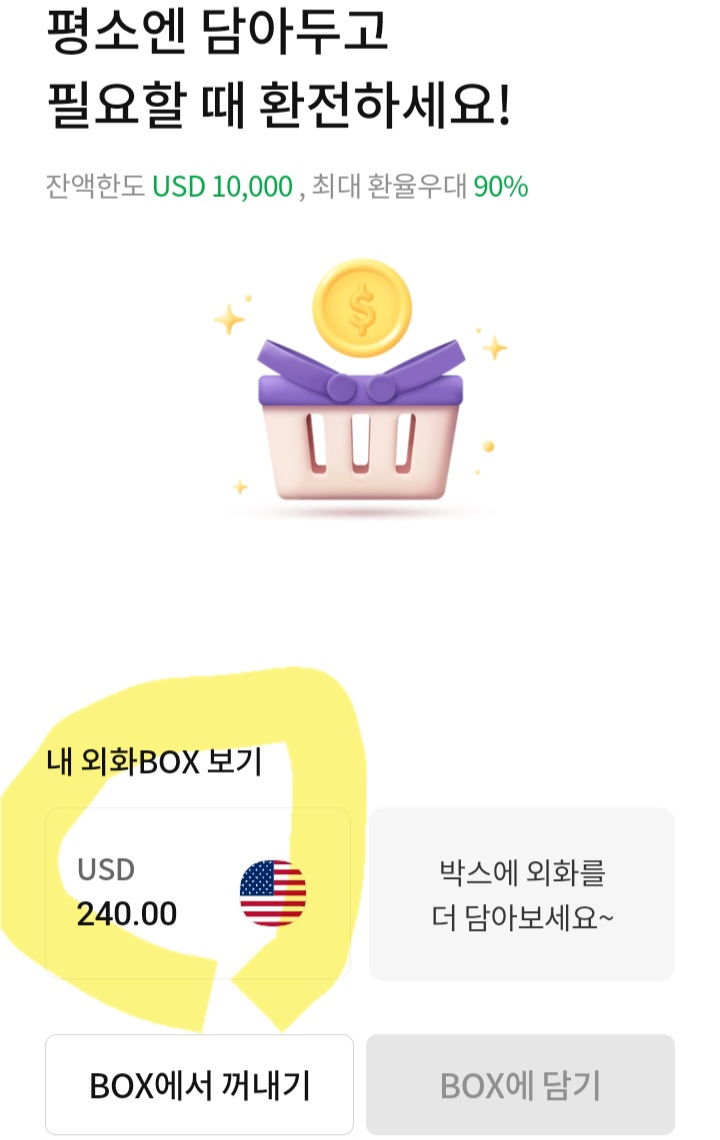 계좌에 현금 입금 후 외환 - '내 맘대로 외화 BOX' 클릭해서 환전했어요.