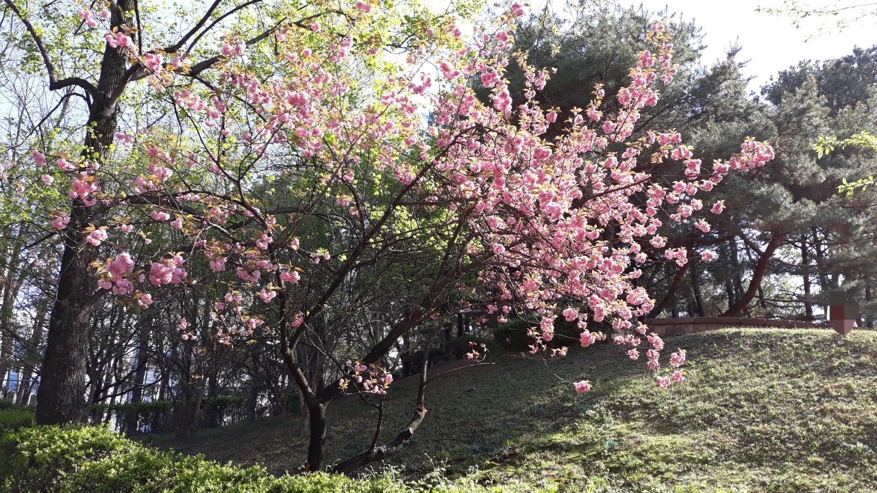 중외공원 야외공연장 주변에 겹벚꽃이 만개했어요. 이 주변은 홍매화, 벚꽃 명소입니다. 꽃들이 다 졌겠거니 하고 산책을 갔는데 분홍색 꽃이 활짝 피어있네요. 주말 내내 비 온 뒤라 공기도 맑고 날씨도 좋았는데, 분홍색 꽃까지 피어 있어서 정말 좋았어요. 요즘 어플로 꽃 사진 인식하면 꽃 이름 다 나와요. 검색했더니 벚나무(벚나무 꽃)라고 나오네요. 벚나무에 종류가 많더라고요. 그중 왕벚나무(많이 알려진 벚꽃)도 있고요. 오늘 본 꽃은 보통 겹벚꽃이라고 하는 것 같아요. 중외공원 야외공연장 주변에 홍매화처럼 나무가 많이 심어져 있는 건 아니지만, 나무마다 꽃들이 많이 피어 있어서 화사 합니다.