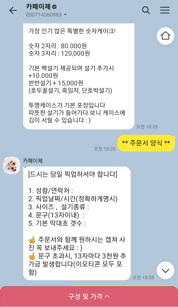 카페이제 광주본점에서 떡케이크 주문했어요. 인스타에 있는 링크 타고 가서 카톡으로 주문서 보냈습니다. 결제는 보내준 계좌로 계좌이체 했어요.