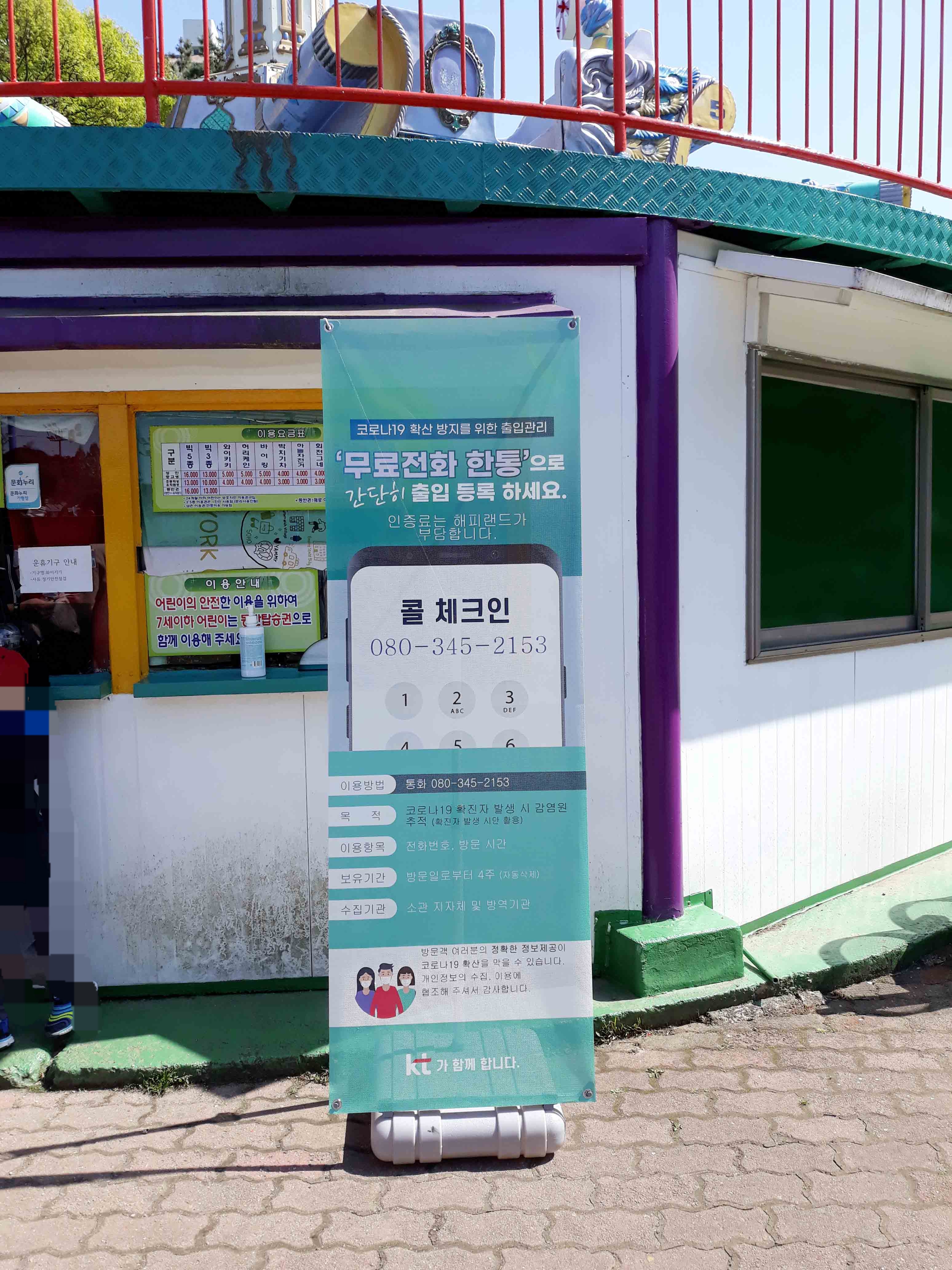 전화통화로 출입등록하라고 안내판 놔뒀어요. 이렇게 하는 게 개인정보 보안에는 더 좋은 것 같네요. 요즘 어딜 가나 전화기는 필수인 것 같아요. 요금은 현재 성인, 중고생 기준 빅 5종은 16,000원 빅 3종은 13,000원 이고요. 초등학생, 유치원생 기준 빅5종은 13,000원 빅3종은 10,000원 입니다. 성인, 중고생 기준 와이키키, 허리케인, 바이킹 5,000원 박치기차, 하늘자전거, 회전그네, 날으는융단, 회전목마, 미니바이킹, 해피피크닉 4,000원 입니다. 초등학생, 유치원생은 1,000원씩 저렴하네요. 7세 이하 어린이는 안전을 위해서 어른과 같이 타라고 써져있어요. 동반탑승권은 빅5종 16,000원 빅3종 13,000원입니다.