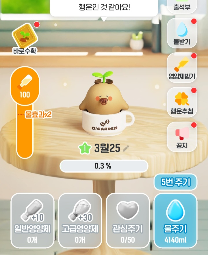 수확해도 남아있던 물과 비료는 그대로 있네요. 6단계까지 해야 수확할 수 있어요.