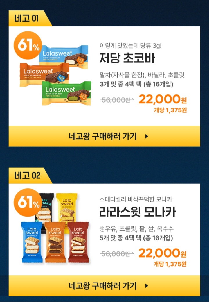 1. 초코바 3종 중 4팩 골라 담기(총 16개입) = 22,000원 *바닐라, 초콜릿, 말차