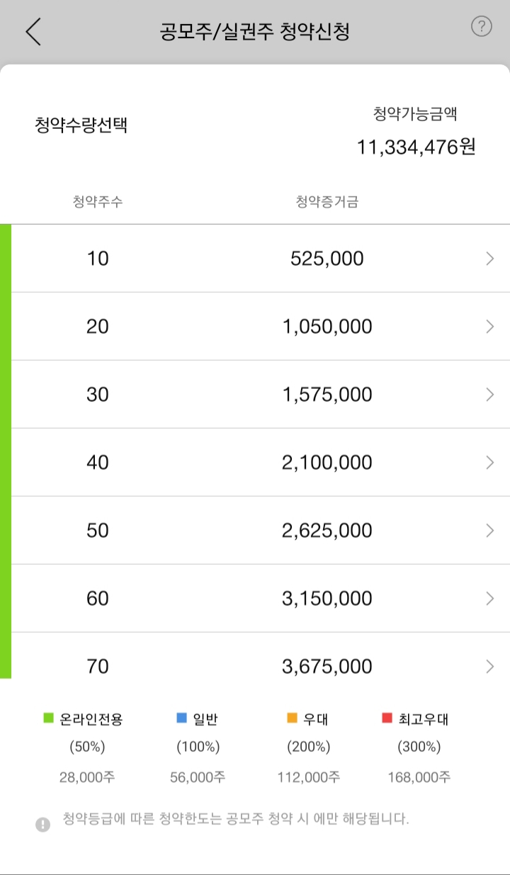 200주 청약증거금은 20주 청약증거금에 0 하나 더 붙인 금액이라고 생각하시면 돼요. 원하시는 청약주수를 누르시면 됩니다.