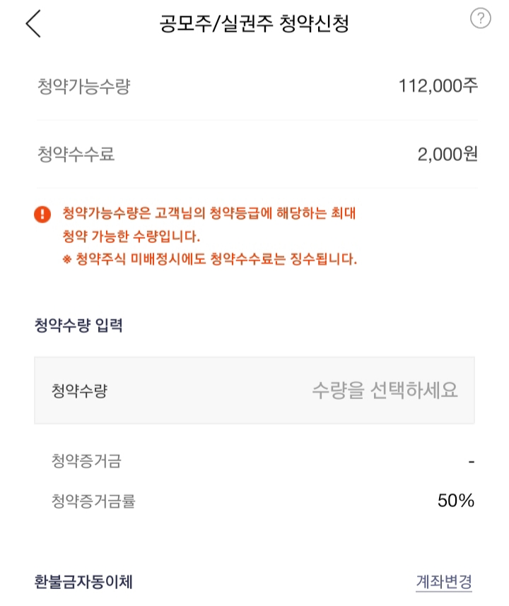 청약수량 입력 밑에 '청약수량 수량을 선택하세요.' 눌러서 원하시는 수량을 선택하면 됩니다. 청약수수료 2천 원 나오네요. 주식 배정 안돼도 돌려주지 않나 봅니다. 1주라도 배정되길... 수수료 값은 나와야지 ㅋ