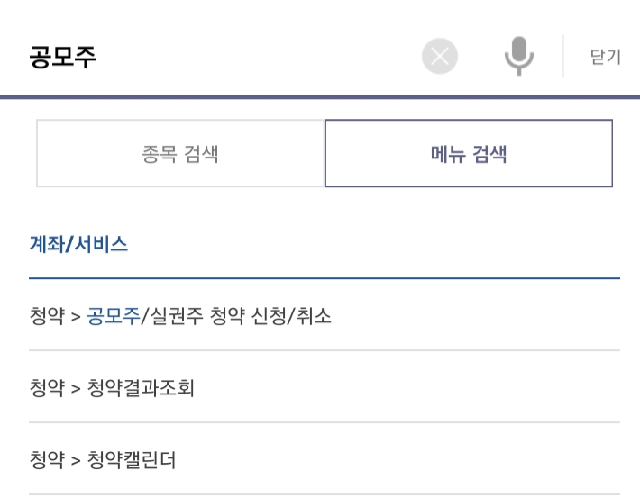 위에는 한국투자증권 첫 번째 화면입니다. 왼쪽 위에 보면 메뉴/종목 검색창 보이시죠? 거기서 공모주라고 검색하시면 됩니다. 그러면 공모주/실권주 청약 신청/취소 가 보이실 거예요.