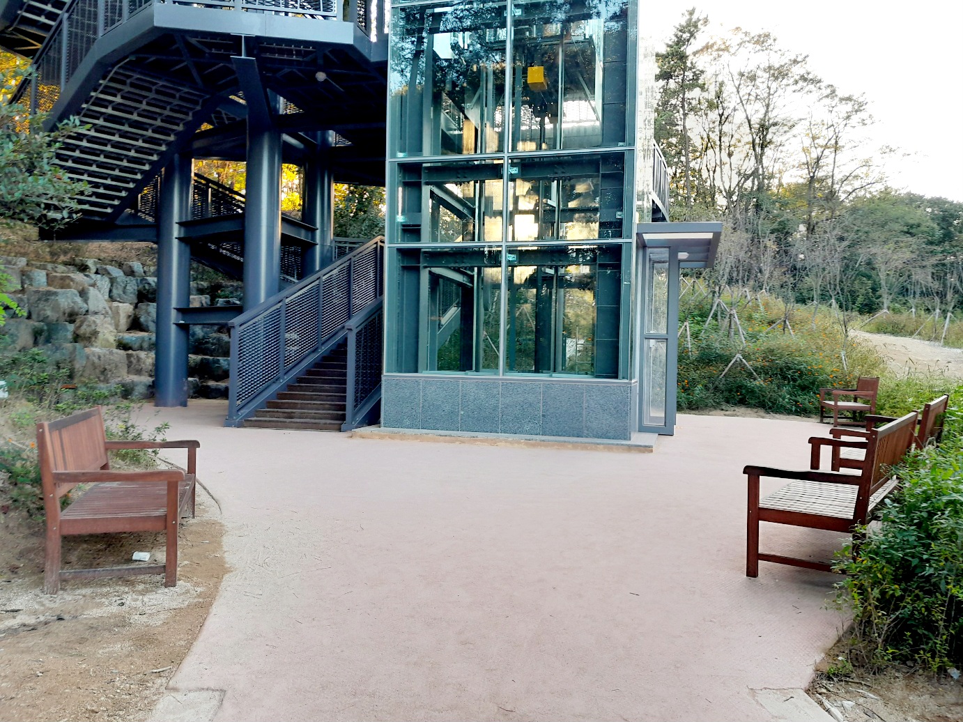 입장시간제한은 없는 것 같아요. 엘리베이터 있고요. 엘리베이터 운행시간은 오전 7시부터 오후 7시까지입니다. 중외공원 놀이터 마주 보고 있는데 놀이터 쪽에 작은 무료 주차장 있습니다. (6대 정도, 장애인 2대)