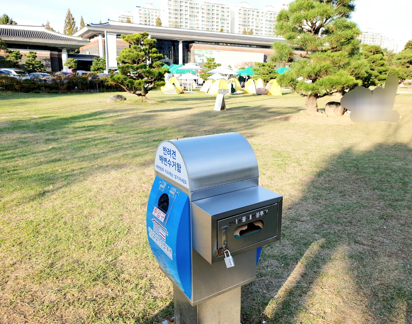반려견 배변수거함이 있어요. 봉투도 있는데 다 떨어졌네요. 뒤에 보이는 건물이 광주역사민속박물관입니다.