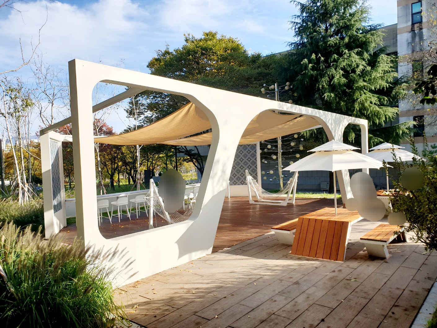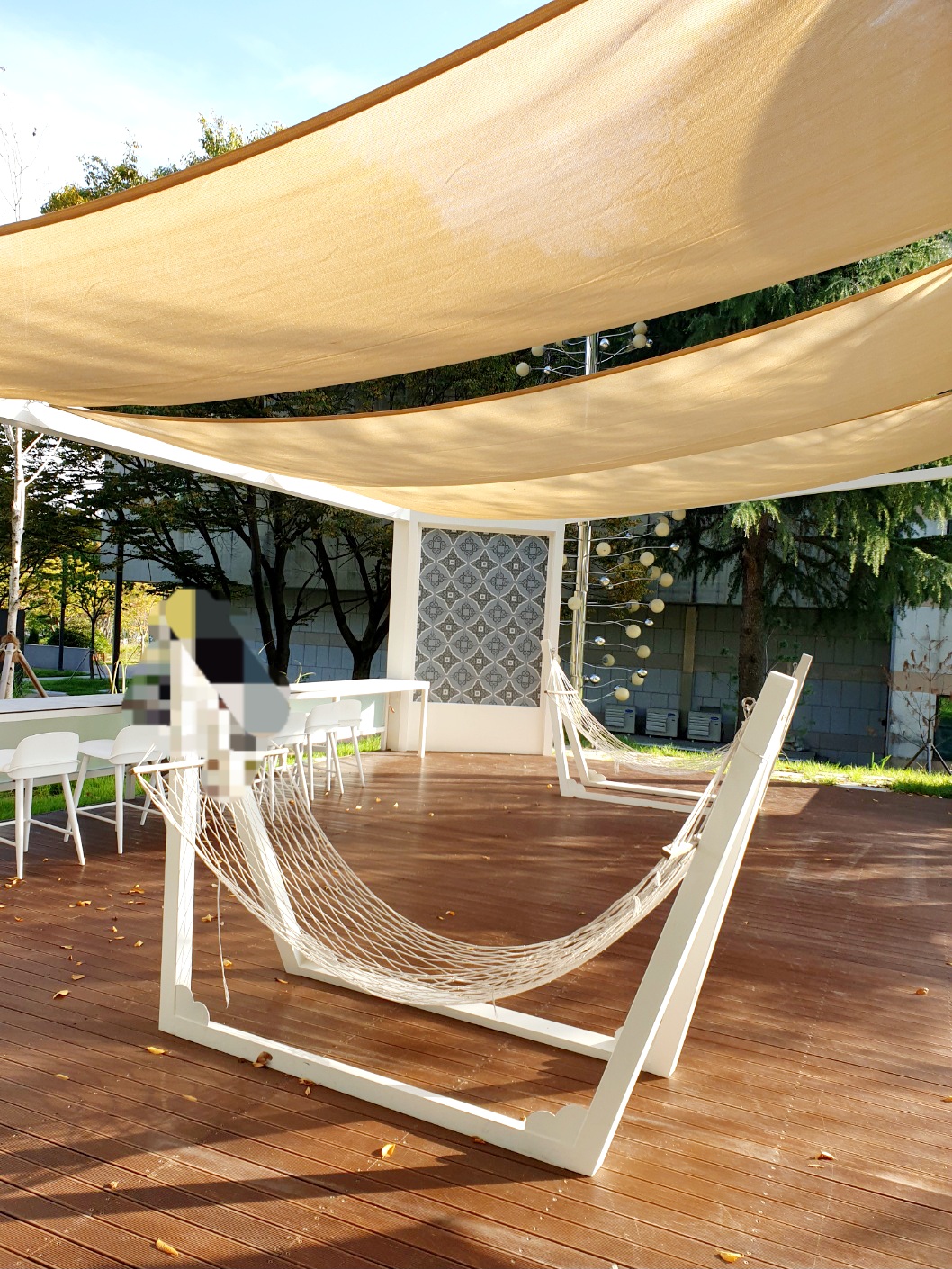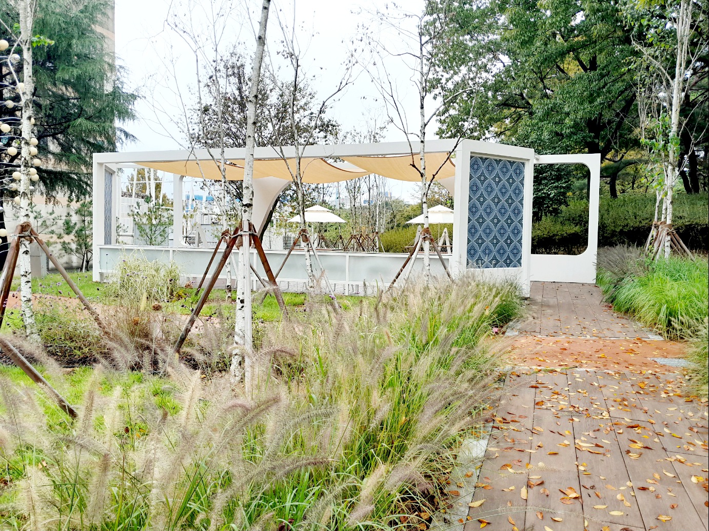천장이 막아진 부분이 있어서 비, 햇빛 피하기 좋아요.