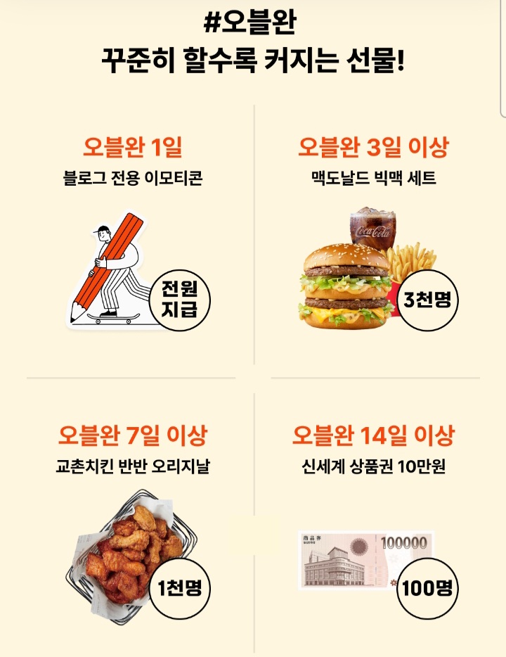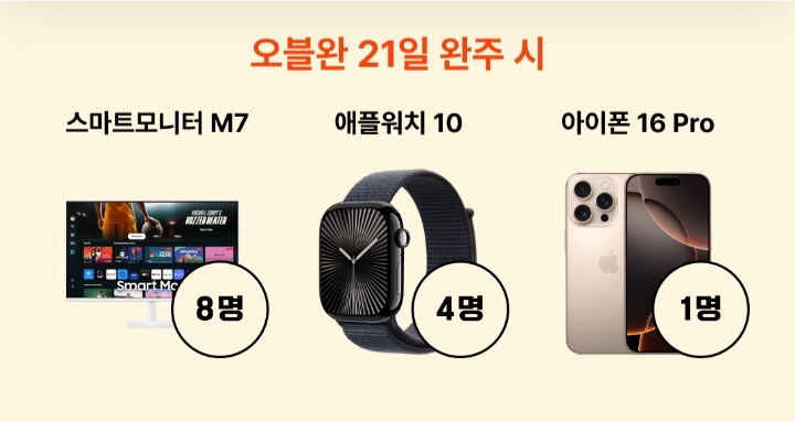 11월 7일부터 11월 27일까지입니다. 20일간 매일 글 써야겠어요. 경품으로는 스마트모니터 M7, 애플워치 10, 아이폰 16 Pro, 맥도날드 빅맥 세트, 교촌치킨 반반 오리지널, 신세계백화점 상품권 10만 원이 있네요.