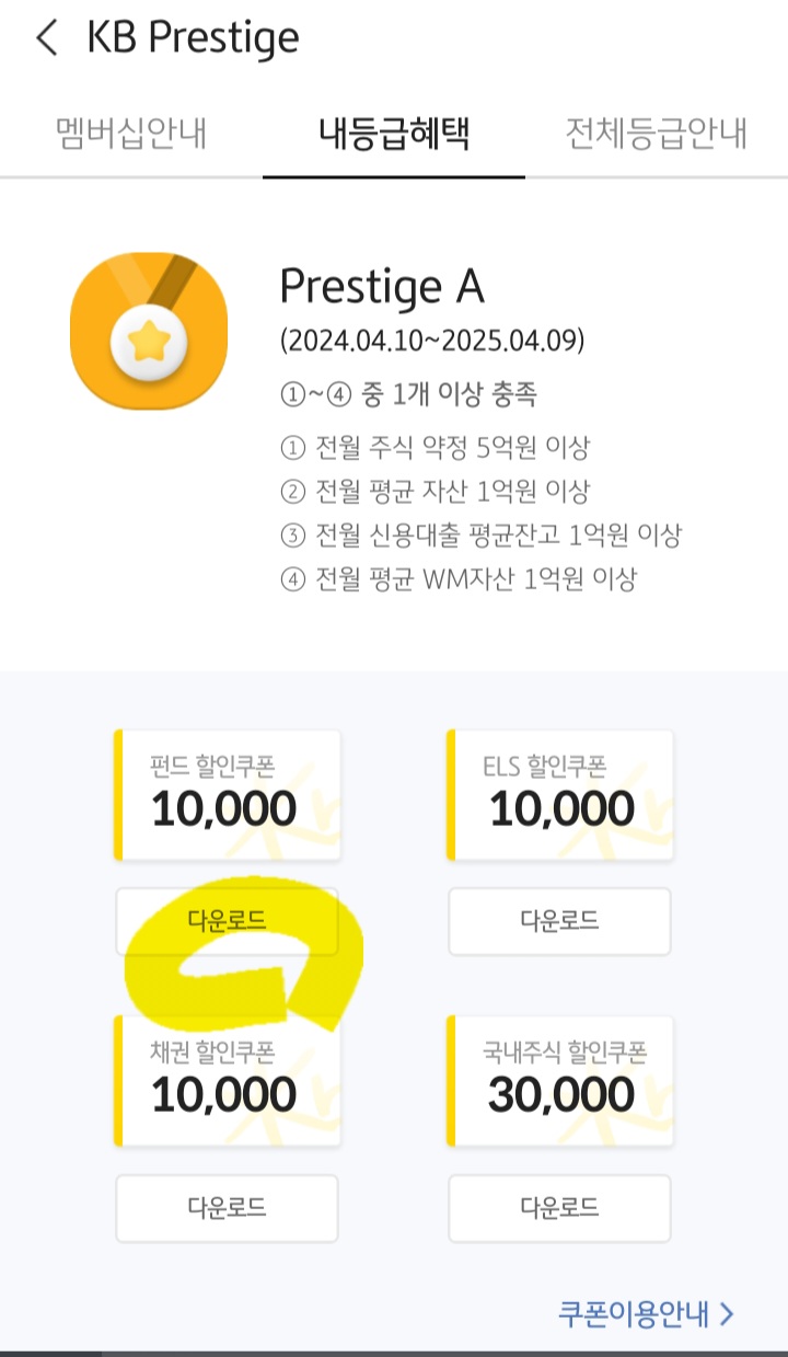 프레스티지 쿠폰 받을 수 있는 조건인데 쿠폰이 안 들어오더라고요. 처음에는 쿠폰함에 매달 저절로 들어왔는데 이제는 쿠폰을 다운로드해야 하네요. 그것도 모르고 한 달 날렸네요.