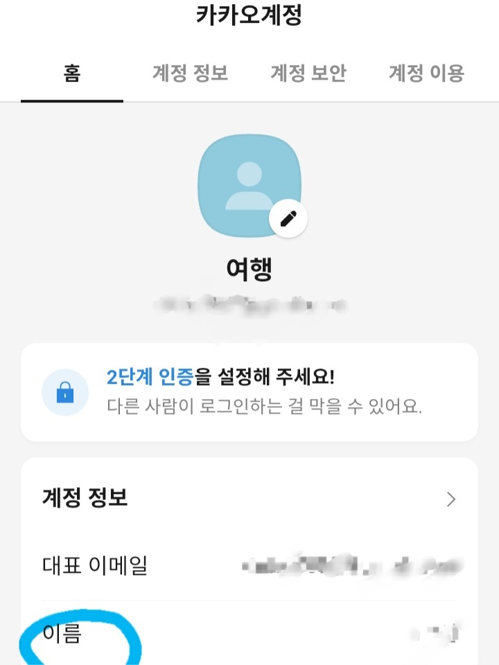 3. 홈 - 계정정보- 이름 클릭 (파란색으로 표시했어요)
