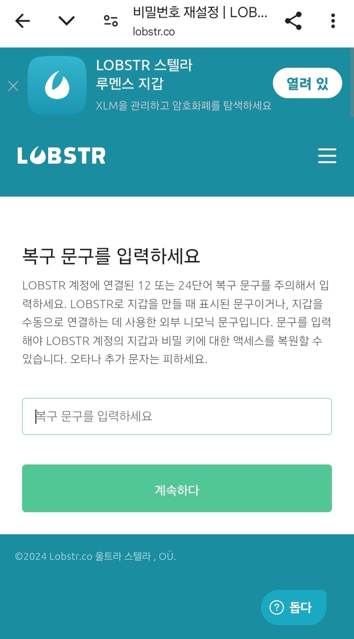 2. 랍스타지갑 생성할 때 적어둔 복구문구를 한 단어씩 띄어 쓴다. 계속하다를 누른다.