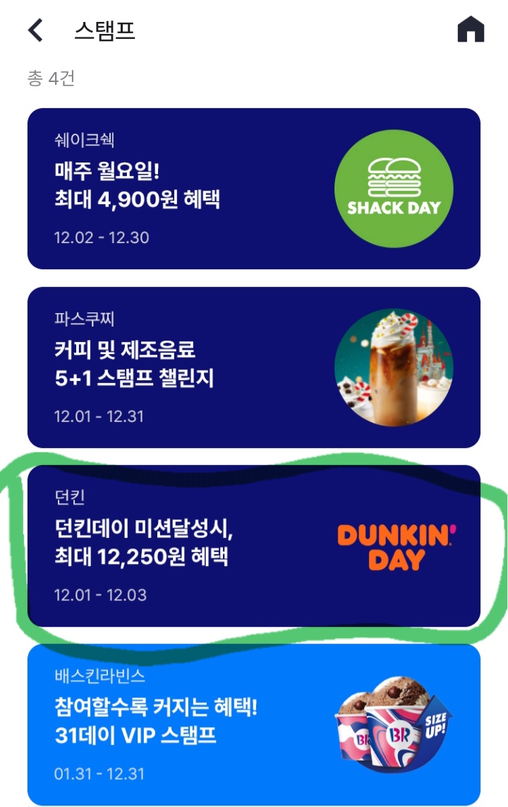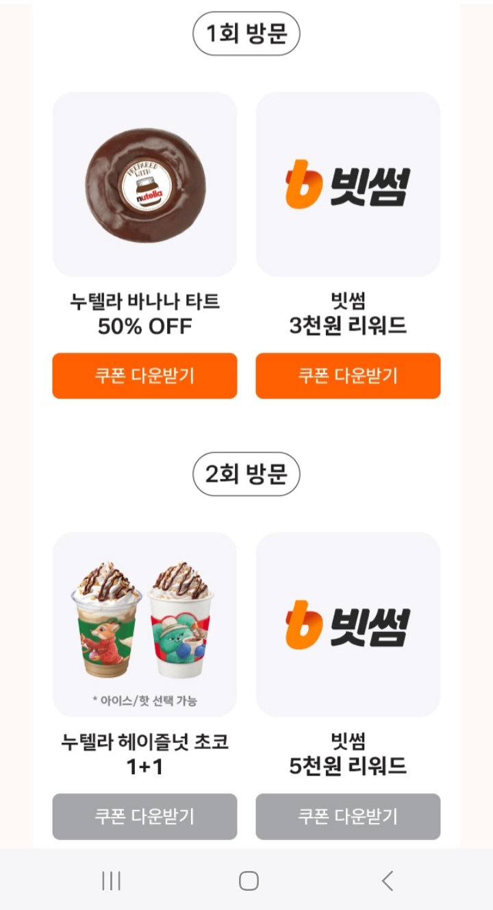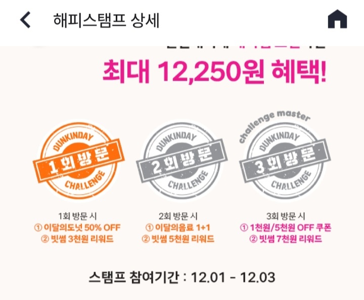 어제는 참여를 못했고 오늘 참여했더니 1회 방문 때 주는 쿠폰이 활성화되네요. 해피포인트 어플 - 혜택 - 스탬프 - 던킨데이 이벤트 클릭 해서 빗썸 쿠폰 다운하면 됩니다.