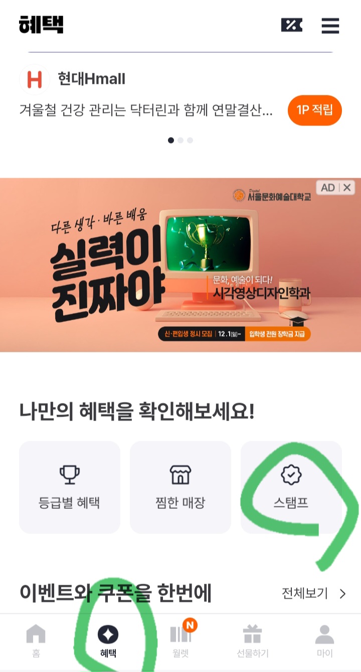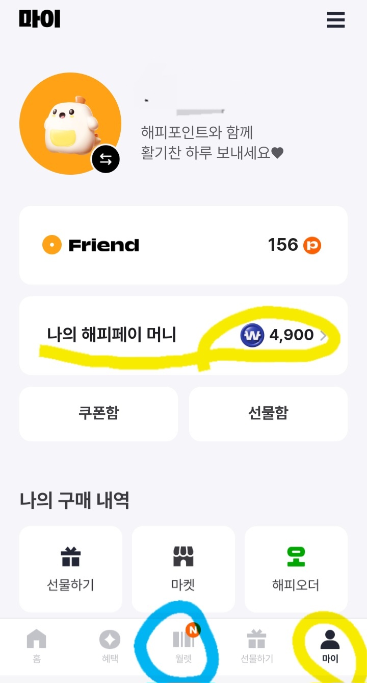 3000원 이상 결재하고 해피포인트 앱에서 바코드 적립받으면 된다고 해요. 저는 해피페이머니가 있어서 해피머니카드로 결제하고, 해피포인트 어플에서 바코드로 적립했어요.(앱 하단 월렛 클릭)