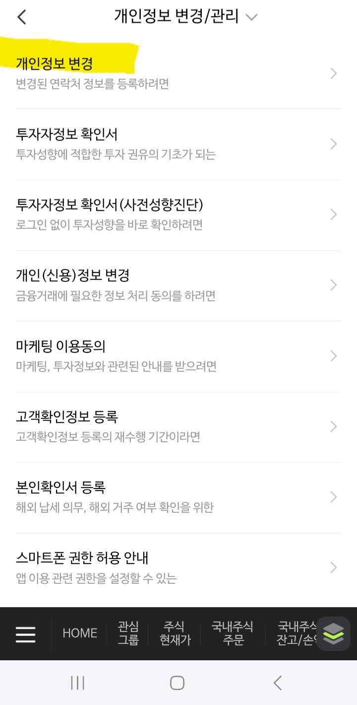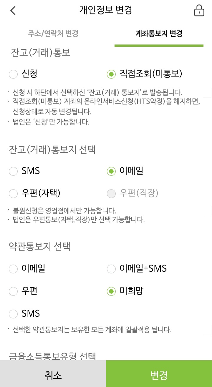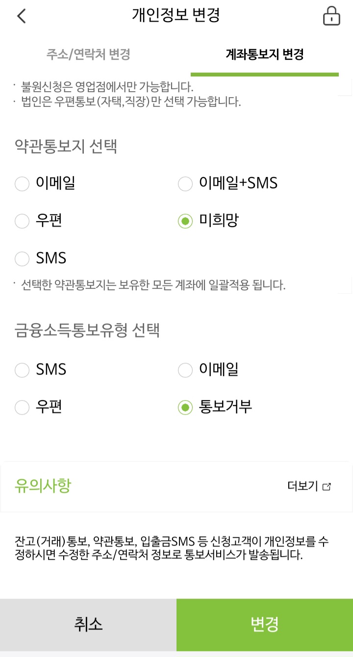 계좌통보지 변경 - 약관통보지 선택 - 미희망