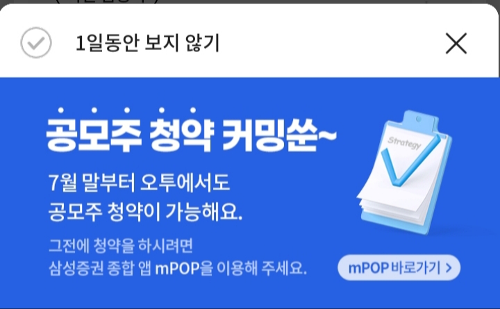 오투 앱에서 공모주 청약이 아직 안되나 봐요. 삼성증권mpop 앱을 설치해주세요. 오투 앱에서 삼성증권 계좌 만들었으니 계좌 있음으로 로그인하시면 됩니다.